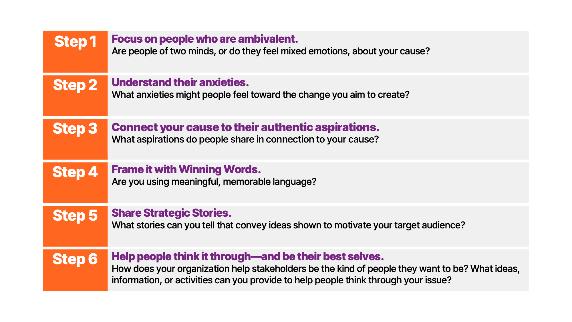 Our Six-Step Framework can help you map out your own path to durable attitude and behavior change: